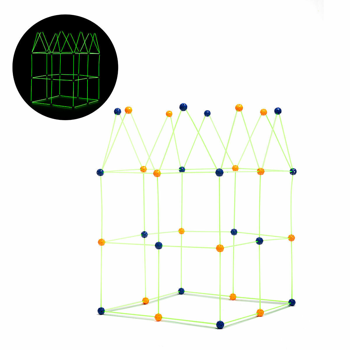 - Bouwpakket, 155 onderdelen: ons bouwpakket voor forten bevat 55 ballen met verbindingsgaten, 100 glowsticks, een afdekdoek, een draagtas om de onderdelen gemakkelijk op te bergen en te vervoeren zodat ze niet kwijtraken, en een handleiding met illustraties van voorbeeldconstructies.