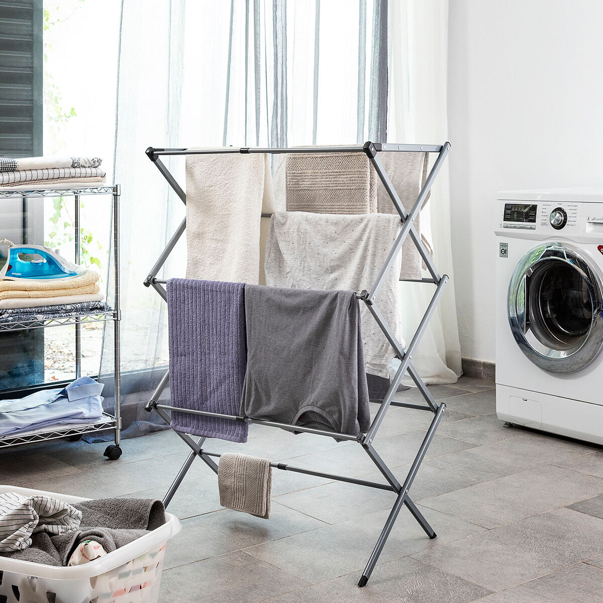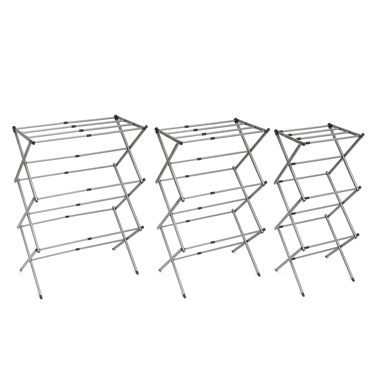 Inklapbare en uitschuifbare kledingdroger met 3 niveaus Ideaal voor het ophangen van kleding en optimaliseren van ruimte gedurende gebruik en opslag. Zijn ontwerp maakt aanpassing mogelijk aan de hoeveelheid kleding die elke keer dient te worden opgehangen, hij is erg handig op te bergen en neem minimale ruimte in beslag. Deze originele metalen wasdroger met grote capaciteit heeft 11 droogbalken, is compact, lichtgewicht en waterbestendig. Hij bevat een geillustreerde handleiding voor gebruik en is eenvoudig te monteren zonder gereedschap.