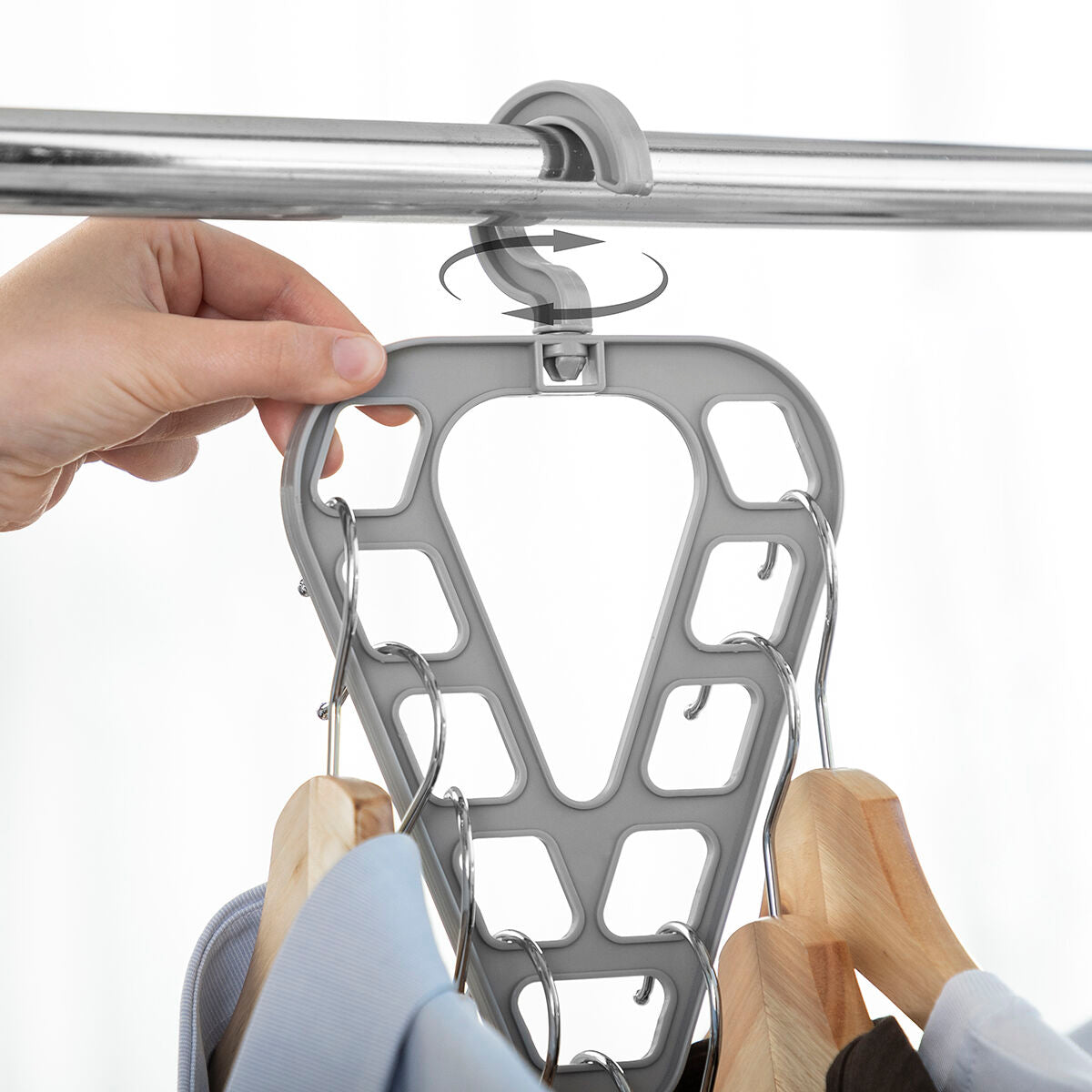 Deze organizers voor kleerhangers zorgen voor een verhoogde opslagcapaciteit voor kleding. De kleerhangers kunnen worden geplaatst in de vorm van een waterval met een minimale scheiding, wat zorgt voor een betere opslag van een grotere hoeveelheid kledingstukken die een kleinere ruimte innemen.